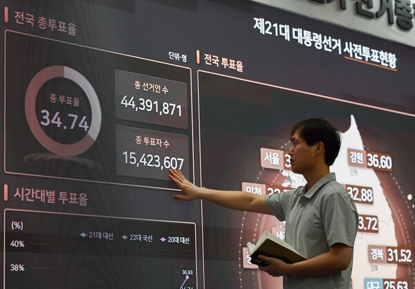 최종 34.74%, 지난 대선보다 낮아 전남 56.5% 최고, 대구는 25.6% 중앙선거관리위원회는 30일 21대 대통령 선거 최종 사전 투표율이 34.74%로 집계됐다고 밝혔다. 선거인 총 4439만1871명 중