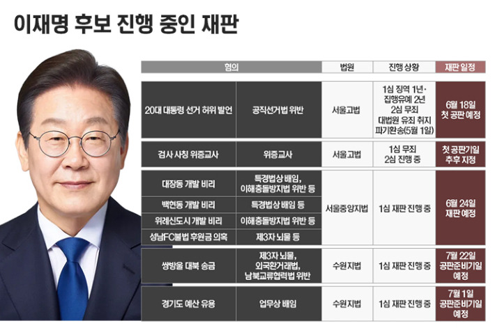이 중 선거법 사건은 대법원이 2025년 5월 1일 유죄 취지로 파기환송한 바 있어, 특히 주목되는 사안입니다.